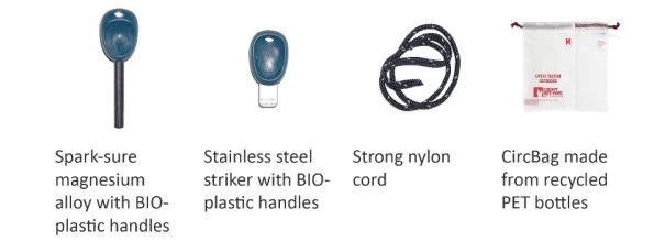 آتش زنه این کیت از جنس آلیاژ منیزیوم بادوام می باشد که قابلیت تولید ۳۰۰۰ جرقه متمرکز با دمای ۳۰۰۰ درجه سانتیگراد را دارد و مناسب برای روشن کردن سرشعله و یا باربیکیو نیز می باشد و شما بدون اتلاف وقت می توانید بارها و بارها بدون مواد شیمیایی و به آسانی آتش روشن کنید. سوت اضطراری در پشت آتش زنه تعبیه شده است تا در صورت لزوم بتوان از آن به راحتی استفاده کرد. لازم به ذکر است تمام مواد پلاستیکی به کار رفته در این کیت، تجدید پذیر بوده و سریعتر وارد چرخه طبیعت می شود.